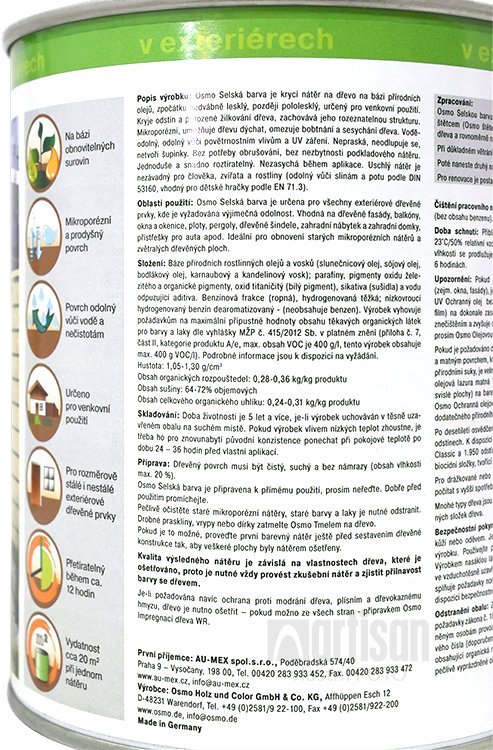 OSMO Selská barva je krycí barva vhodná do exteriéru pro všechny typy dřeva. Velmi snadno se s ní pracuje, je velmi trvanlivá povětrnostním podmínkám. Pro natírání fasád a zahradních domků.