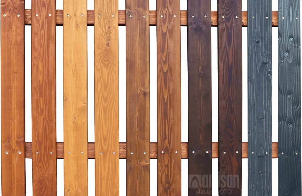- Odstíny barvených plotovek z kanadské douglasky - modřín, borovice, ořech, palisandr, antracit.