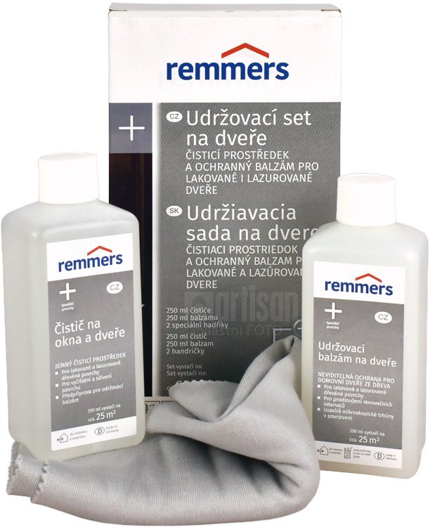 REMMERS Udržovací set je souprava čistícího prostředku a balzámu pro ošetření dřevěných dveří natřených lazurou nebo krycím nátěrem. Vhodný do interiéru i exteriéru.