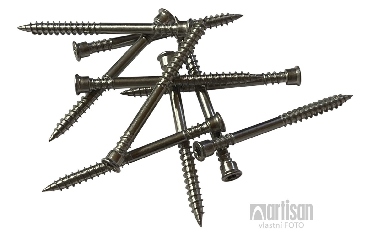 - Zápustná hlava 60° - malý průměr hlavy, díky které si zajistíte malou viditelnost a snadné zapuštění do slabých i tvrdých materiálů. Vhodná i do míst, kde dřevo více bobtná.